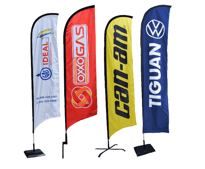 Incluyen base, mástil y bandera impresa.